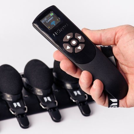 Optioneel is een afstandbediening beschikbaar. Hiermee kan een DoseBadge5 worden gestart en worden gestopt en kunnen tussentijds meetresultaten van een DoseBadge5 worden bekeken.