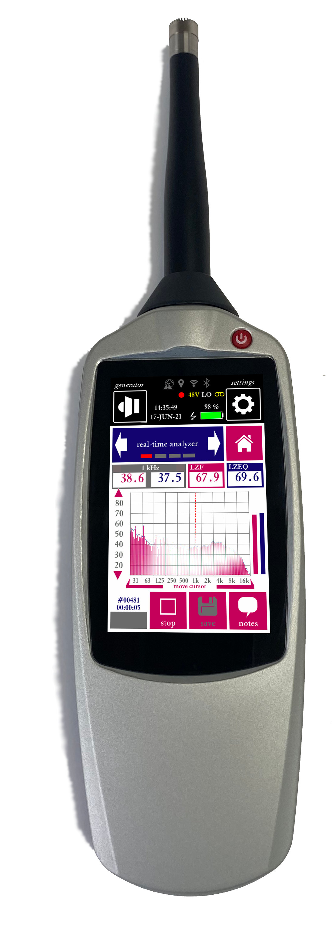De AM-100 is een klasse 1 integrerende geluidniveaumeter en real-time spectrum analyser in 1/1 octaaf en 1/3 octaaf banden (tertsbanden), 1/6 octaafband + 1/12 octaafband conform de normen IEC 61672, IEC 60651, IEC 61260 en IEC 60804.
